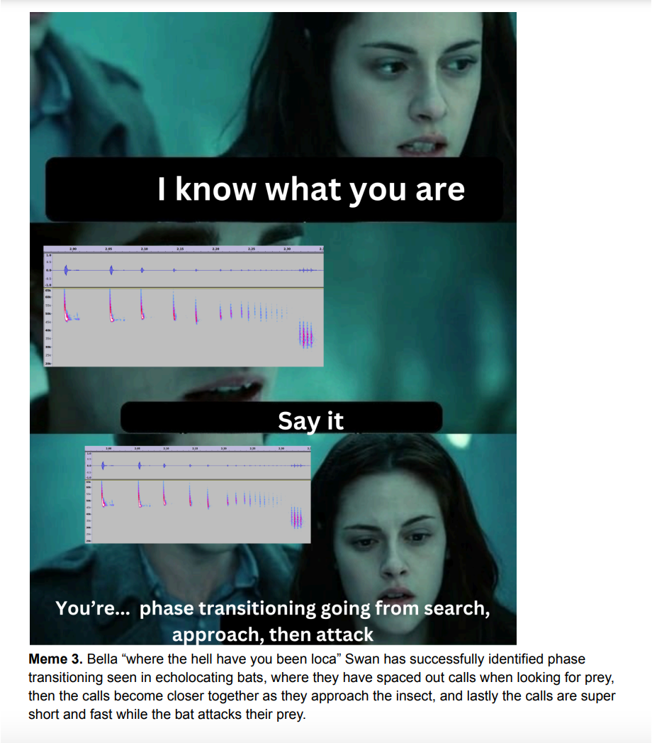 A Twilight meme: It was inevitable. Dr. Frank has taken a passionate interest in a category of mammal that often is overlooked. While she may appreciate their natural beauty, many bats have endured hateful and spiteful words for so long that they have a negative perception of themselves. Bat skin is rich in elastin so that they can easily maneuver in flight, conforming their wings to fly around potential obstacles or in interesting directions, such as upside-down. Their conformity often is useful during feeding, thus gifting them the “skin of a killer.” Author: Lydia Benson, 2024
